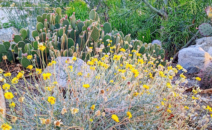Topping out at around 12 inches tall and spreading up to 2 feet wide, Desert Marigold is ideal for compact spaces, mass plantings, rock gardens, and roadsides. It is extremely drought-tolerant and thrives in hot, dry conditions. Overwatering can cause rot, so it's best suited to landscapes with infrequent supplemental irrigation. Although it is relatively short-lived, it reseeds freely, allowing colonies to persist in the landscape with minimal maintenance.