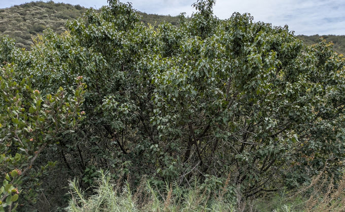 Hollyleaf Cherry is the most widely distributed subspecies of native cherry in California. It thrives in chaparral, coastal sage scrub, and southern oak woodland habitats. Its size varies greatly depending on conditions: in dry, rocky, or shallow soils, it grows as a dense shrub (5–15 feet tall), while in richer soils it can become a small tree reaching 30–40 feet. The glossy, evergreen leaves resemble holly in shape and texture, lending the plant its common name.